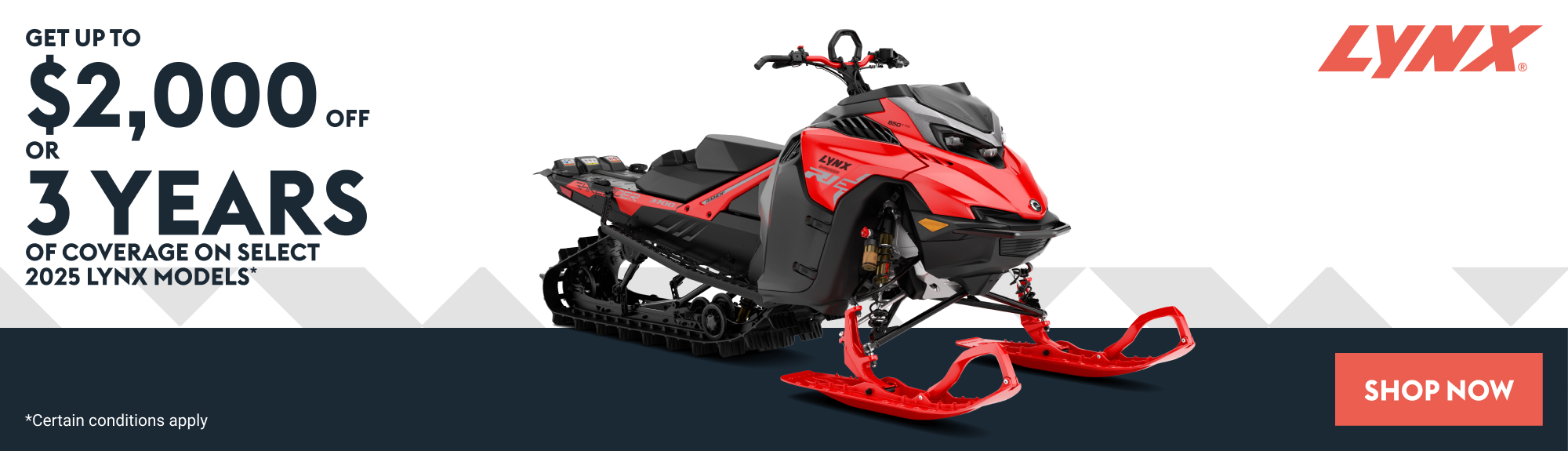 ©2025 Bombardier Recreational Products Inc. (BRP). All rights reserved. ®, ™ and the BRP logo are trademarks of BRP or its affiliates. In the U.S.A., products are distributed by BRP US Inc. Offers valid in U.S.A. only from August 1, 2025 to October 31, 2025. The conditions may vary depending on your location and this offer is subject to termination or change at any time without notice. This offer is not refundable, exchangeable or transferable (including from one dealership to another), cannot be redeemed for cash, credit or other products of equivalent value and cannot be combined with any other offer or rebate. Null where prohibited by law. Until supplies last. Returns of any portion of the purchase will require equal forfeiture of offer or amount equal to the offer. Eligible models are new and unused 2025 Ski-Doo and Lynx models (excl. Youth and NEO models). † Rebate up to $2,000 on select 2025 Ski-Doo and Lynx models: Consumers who purchase an MXZ (excl. Youth and NEO models) are eligible to a $2,000 rebate. Consumers who purchase a Grand Touring or a Summit models are eligible to a $1,500 rebate. Others new and unused 2025 full-sized snowmobile models are eligible to a $1,000 rebate. †† Get 3 years of coverage: The buyer of an eligible model will receive a 12-month BRP Limited Warranty plus a 24-month B.E.S.T. coverage. Subject to the exclusions, limitations of liabilities and all other terms and conditions of BRP’s limited warranty and B.E.S.T. contract, including without limitation the exclusions of damages caused by abuse, abnormal use or neglect. B.E.S.T. service contract is subject to a $50 deductible on each repair. For complete details, please see the BRP limited warranty and the B.E.S.T. contract. ††† Financing starting at 1.99% for 36 months: Examples of monthly payments required over a 36‑month term at a 1.99% APR (Annual Percentage Rate): $28.64 per $1,000 financed. An example of a monthly payment with $736 down, no rebate, an APR of 1.99% for 36 months at an MSRP of $10,199 is $271/mo. Total cost of borrowing $293.12 with a total repayment obligation of $9,756.12. Down payment may be required. Other financing offers may be available. Minimum and Maximum Amount Financed may vary. Not all buyers will qualify. Higher rates apply to buyers with lower credit ratings. Other qualifications and restrictions may apply, depending on the participating financial institution(s). BRP is not responsible for any of the financing terms and conditions. Carefully read the operator's guide and safety instructions. All adult snowmobile models are meant to be used by drivers of age 16 and older. Observe applicable laws and regulations. Always wear appropriate protective clothing, including a helmet. Riding and alcohol/drugs don’t mix. Always ride responsibly and safely. See your authorized BRP dealer for details and visit https://ski-doo.com/.