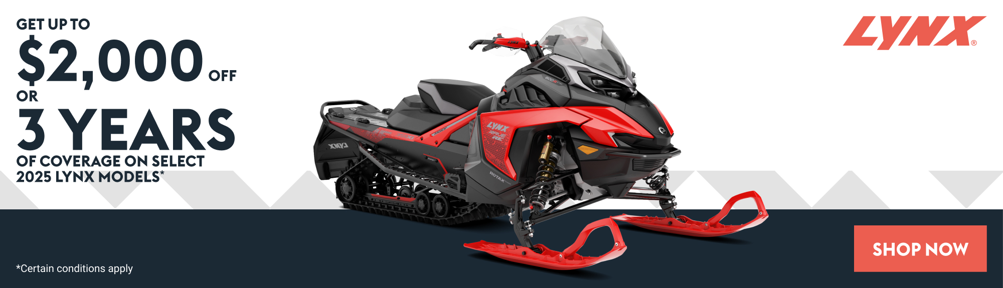 Get a rebate up to $2,000 or 3 years of coverage or financing starting at 1.99% for 36 months on select 2025 Ski-Doo and Lynx models (deep snow)